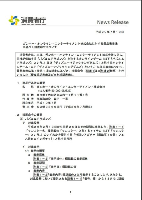 消費者庁は19日、ガンホー・オンライン・エンターテイメントに対し、