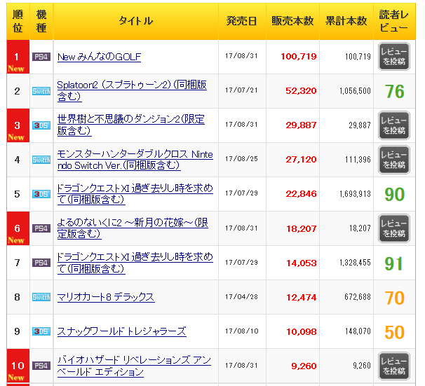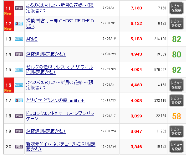 正直switch版よるのないくに2は圏外もありえると思ってたが意外と頑張ってるな