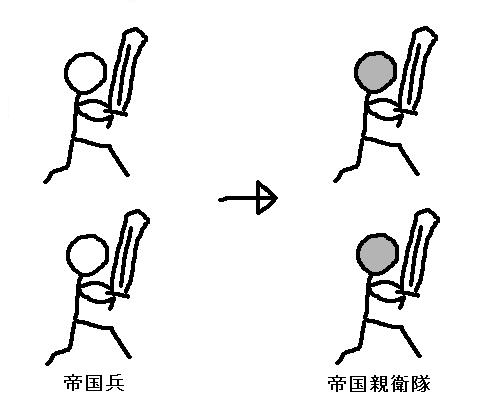 雑魚敵のポーズは同じだけど鎧とか武器が豪華になっていくって事だろ?