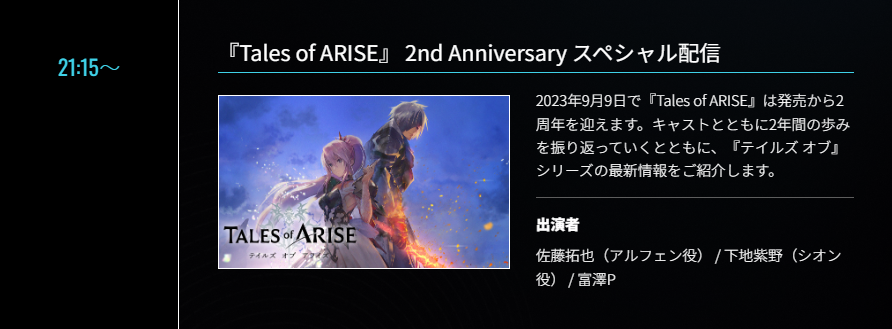 ■9月23日21:15~ 『Tales of ARISE』 2nd Anniversary スペシャル配信