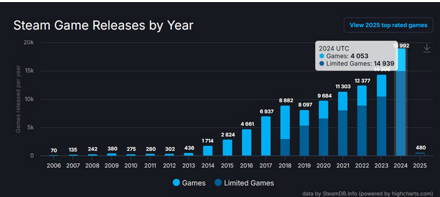 昨年Steamでリリースされた作品数は1万8121本と従来と比べても極めて多く、総収益が76億ドルとなり2020年クラス。