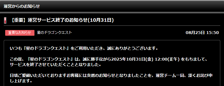 この度、『星のドラゴンクエスト』は、誠に勝手ながら2025年10月31日(金) 12:00(正午)をもちまして、サービスを終了させていただくこととなりました。