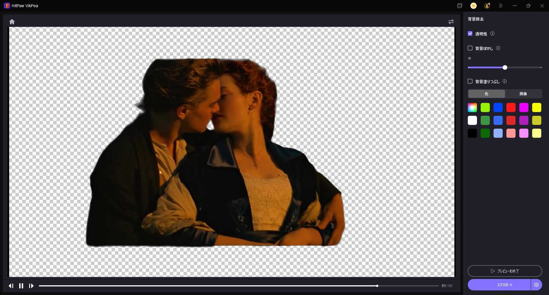 60フレームまでなら無料でプレビューを確認。左にあるタブの中から「AIツールボックス」を開き、「背景除去」を選択。