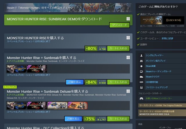 モンハンライズとサンブレイクがSteamで過去最安値を更新したようですね!