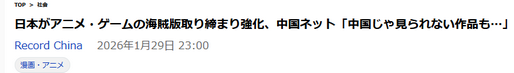 これに中国のネットユーザーからは「好きに取り締まればいいよ。どうせ自分は見ないし」「やるならやればいい。最悪、日本作品に一切触れなくなるだけ。ちょうど中国作品が伸びてきてるし」との強気なコメントが寄せられたが、「それは無理。中国アニメは正直ダメ」「今一番うらやましいのはお金持ち。お金があれば、私が見られない本やアニメをたくさん見られるから。中には検閲のせいで中国じゃ見られない作品もあるし」との現実的なコメントも見られた。